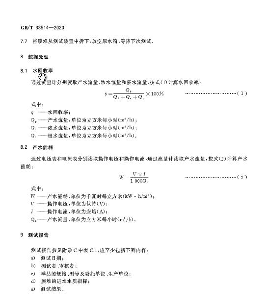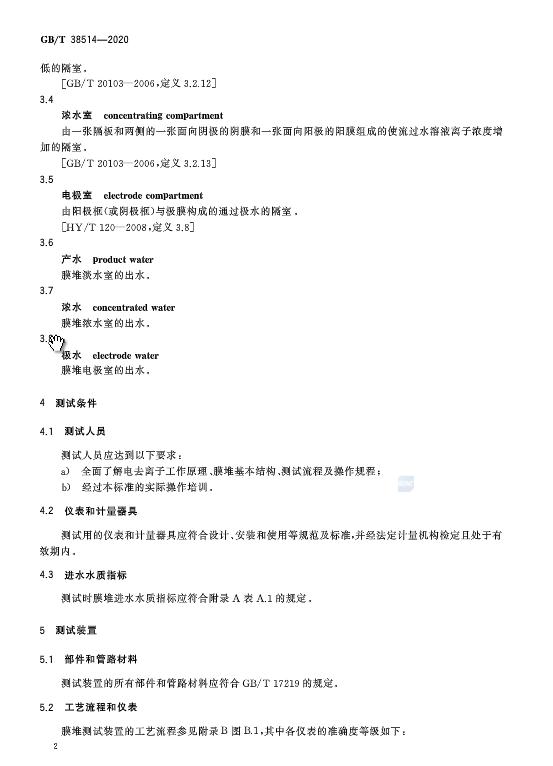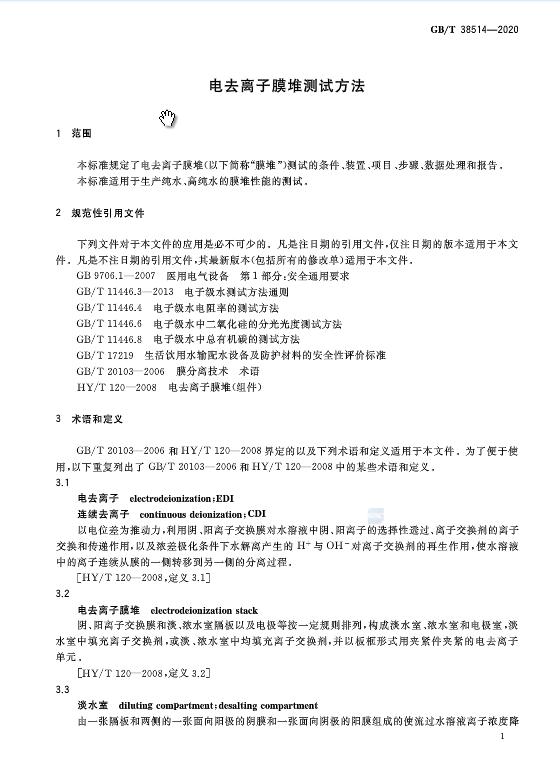 《電去離子膜堆測試方法》GB/T 38514-2020于近日發布,2021年2月1日起施行。